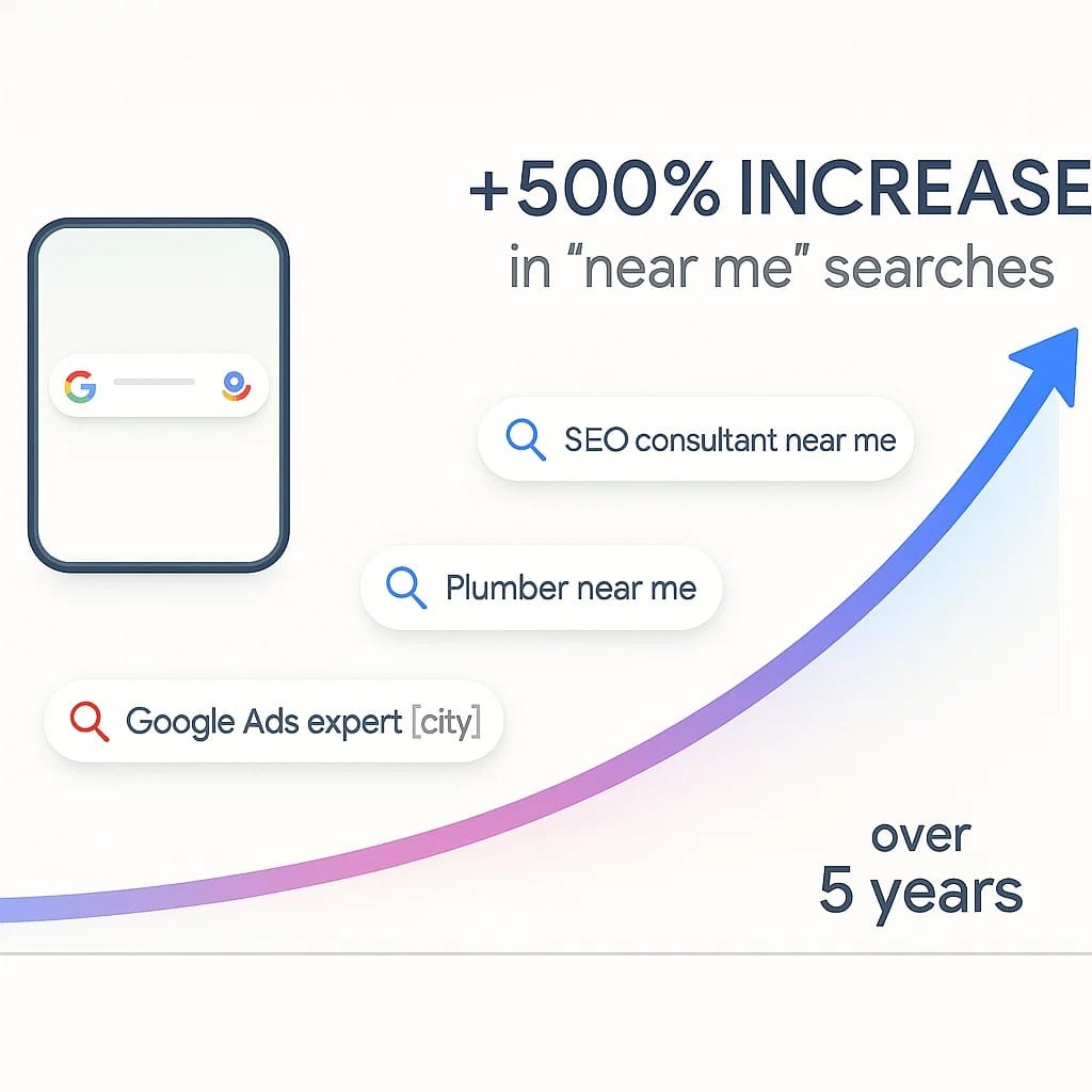 Over 80% of consumers now include phrases like “near me” when searching for services. According to Google’s latest trend data, “near me” searches have increased by over 500% in the past five years. For example: