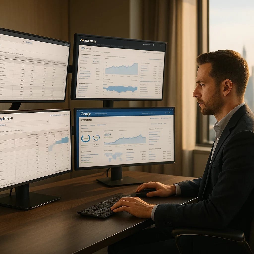 • Semrush / Ahrefs: Great for uncovering competitor keyword gaps and discovering long-tail, service-based phrases.