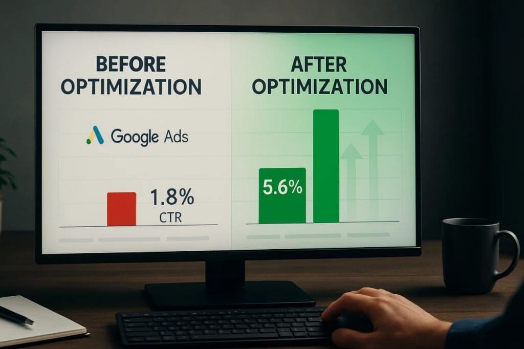 Caption: This screenshot illustrates the positive impact of optimizing ad headlines and targeting. The “Before Optimization” period shows a CTR of 2.1%, while after implementing more specific keywords and compelling ad copy, the “After Optimization” period demonstrates a significant increase to 5.8%. This improvement resulted in more qualified traffic and a better return on ad spend. Further analysis of search terms during the “Before” period revealed several irrelevant keywords that were subsequently added as negative keywords, contributing to the higher relevance and improved CTR seen in the “After” period. Consistent monitoring and iterative adjustments, as demonstrated here, are key to maximizing the effectiveness of Google Ads campaigns.